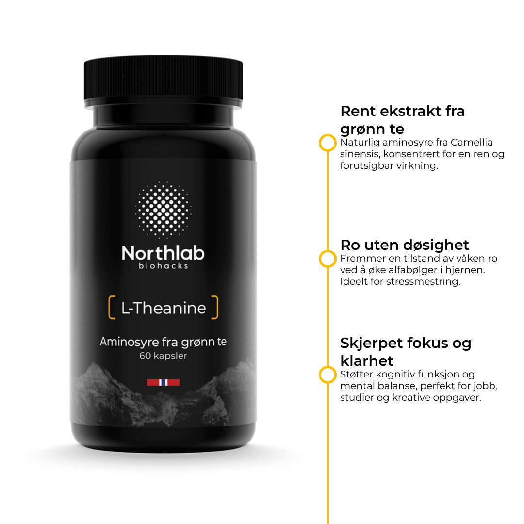 I en verden som kjemper om din oppmerksomhet, er evnen til å fokusere en superkraft. Northlab L-Theanine er utviklet for å støtte nettopp dette. Formelen er basert på hemmeligheten bak den unike effekten av grønn te, aminosyren L-theanine, konsentrert for en ren og forutsigbar virkning.